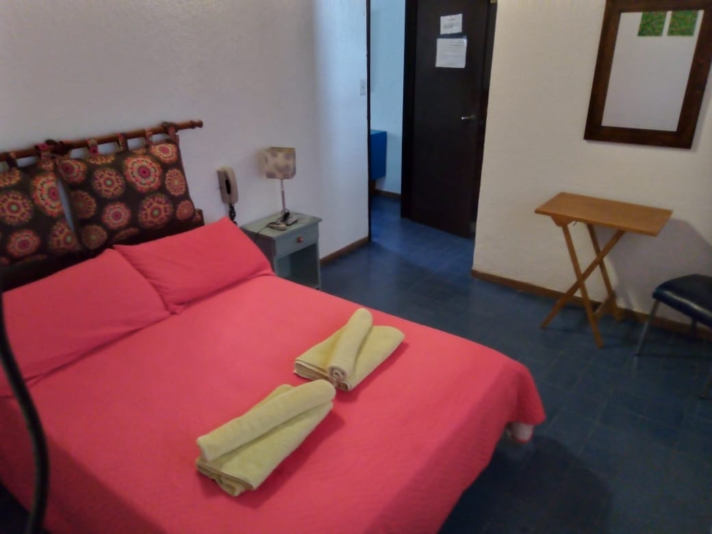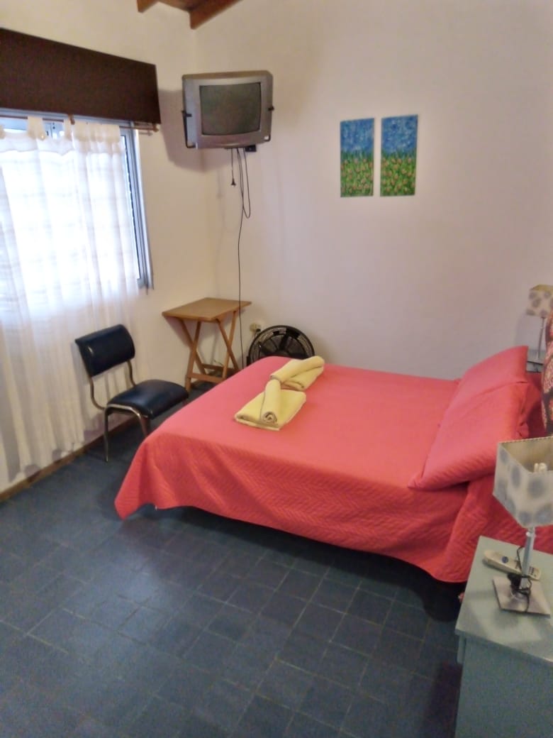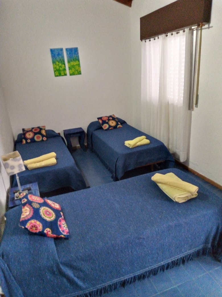 Habitación con una cama matrimonial y tres camas individuales, baño privado, televisión, servicio de wifi y ventilador.